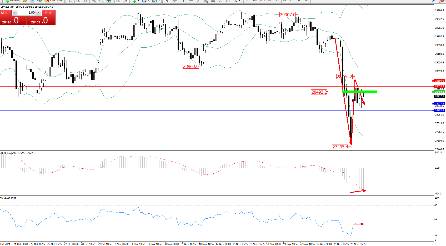 交易策略:28493下方看跌,目标28277、28152