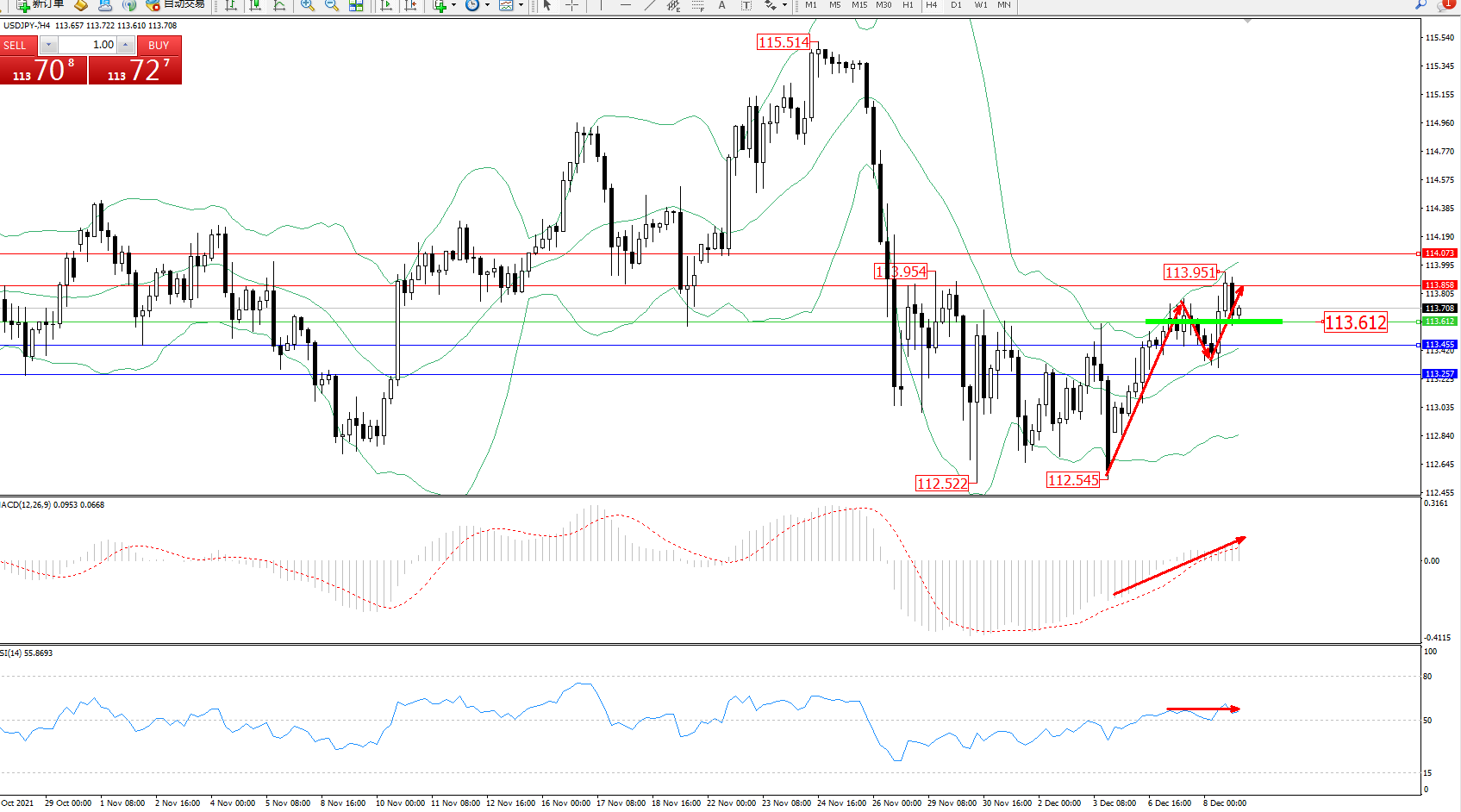 交易策略:113.612上方看涨,目标113.858、114.073