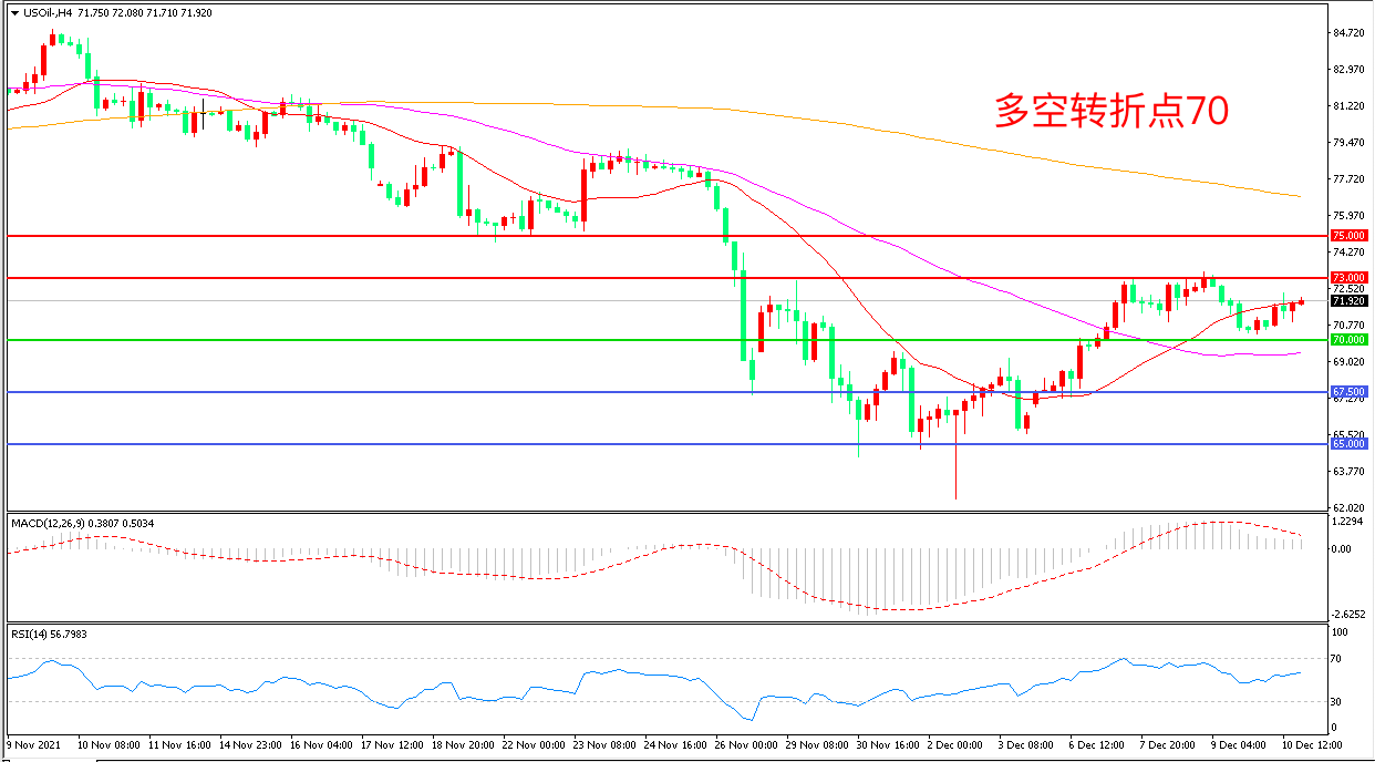 4小时图看,油价延续高位调整,区间震荡继续明显,70美元成为下方支撑,73美元成为上方阻力,MACD红柱缩短,RSI指标走平,日内延续震荡概率较大。