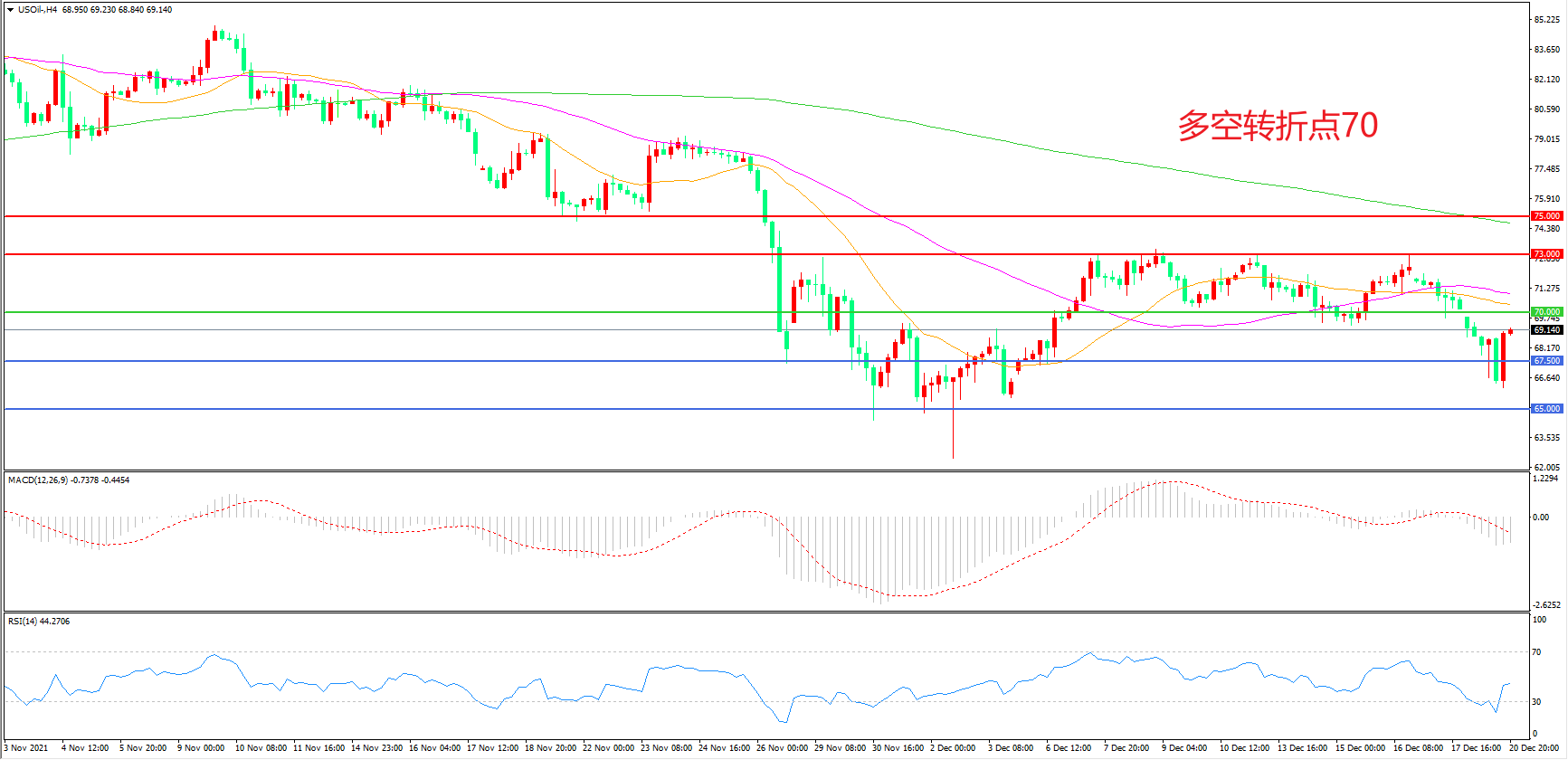 交易策略:在70.00之下看跌,目标67.50        65.00