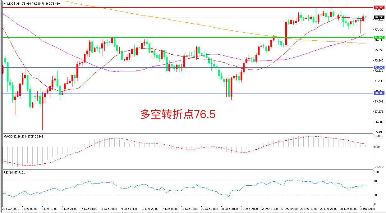4小时图看,油价延续区间震荡,横盘迹象明显,76.5美元成为下方支撑,80美元成为上方阻力,MACD红柱增加,RSI指标走平,日内震荡上行概率较大。
