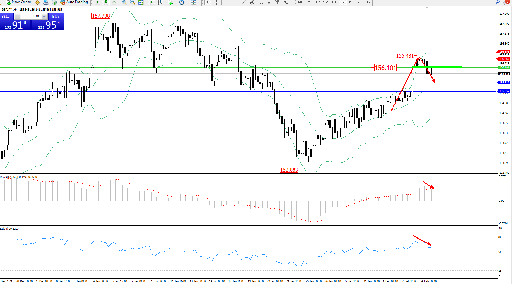 交易策略:156.101下方看跌,目标155.627、155.352