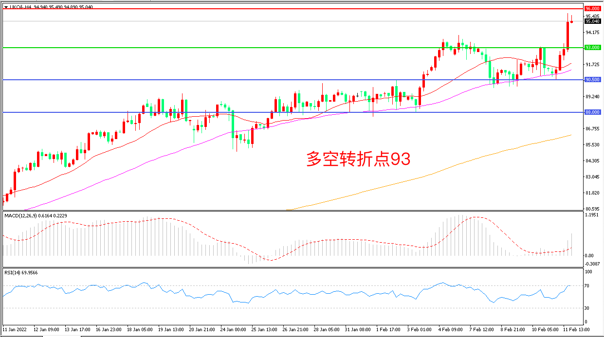 4小时图看,油价回踩均线后再度上行,短期走势偏强, 93美元一线被突破,MACD红柱增加,RSI指标走平,日内震荡上行概率较大。