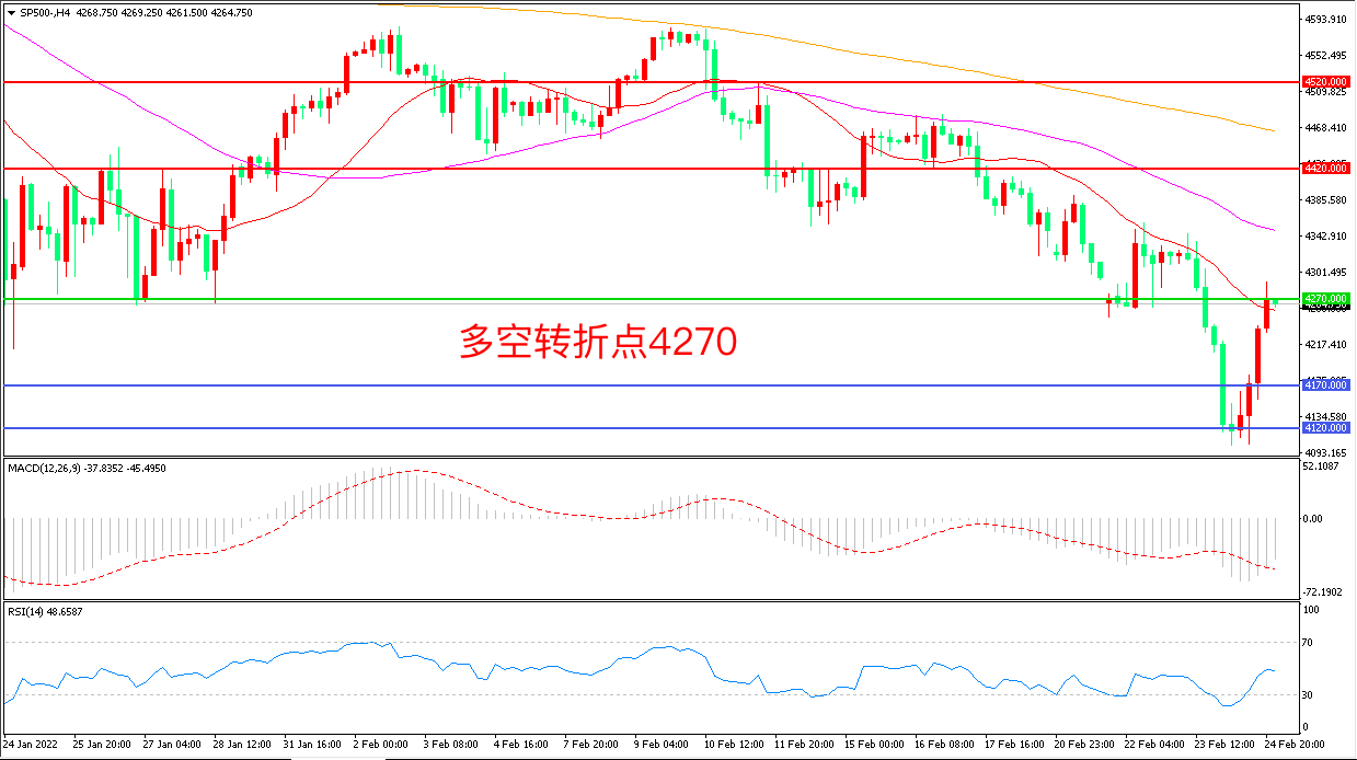 周四(2月24日),受俄乌战争爆发影响,美股开盘一度大幅下挫,但“靴子落地”的行情也让部分投资者选择抄底,标普500先跌后涨,收报4268.75点。俄乌危机升级对全球经济金融造成了巨大冲击,但由于美国总统拜登已强调美国不会派兵到乌克兰作战,战争结束可能较快,除非进一步俄乌冲突演化成更大规模的战争,否则避险情绪将趋于缓和。