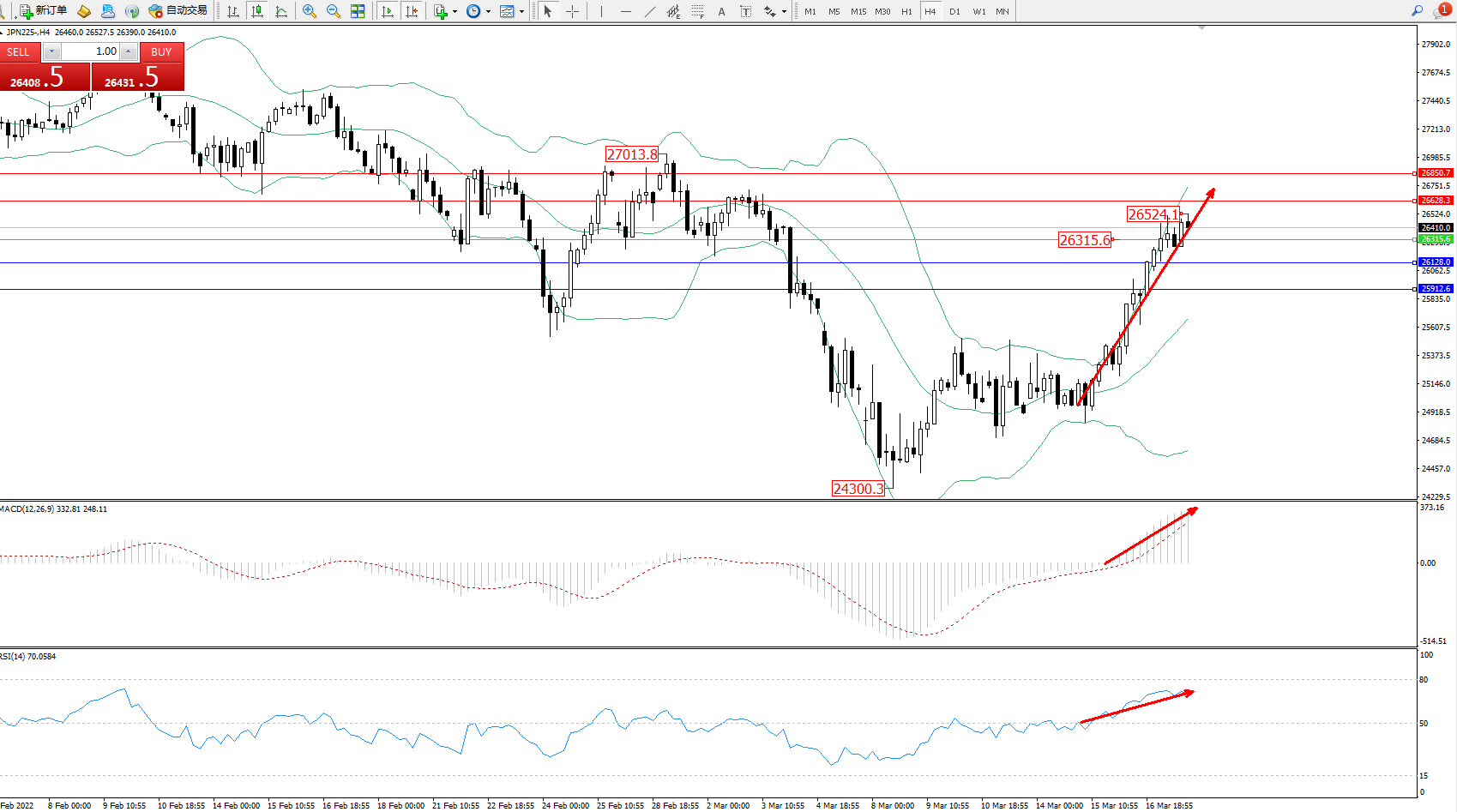 技术点评:多头动力延续布林带指标上轨附近持续震荡上扬,高位抵达26524位置节点后开始整理,短期多头动力有继续拉升态势,布林带指标呈张口走势持续后有短暂收口迹象,MACD指标处于多头区域维持震荡上移,RSI指标处于多头区域维持整理不断向上移动中;