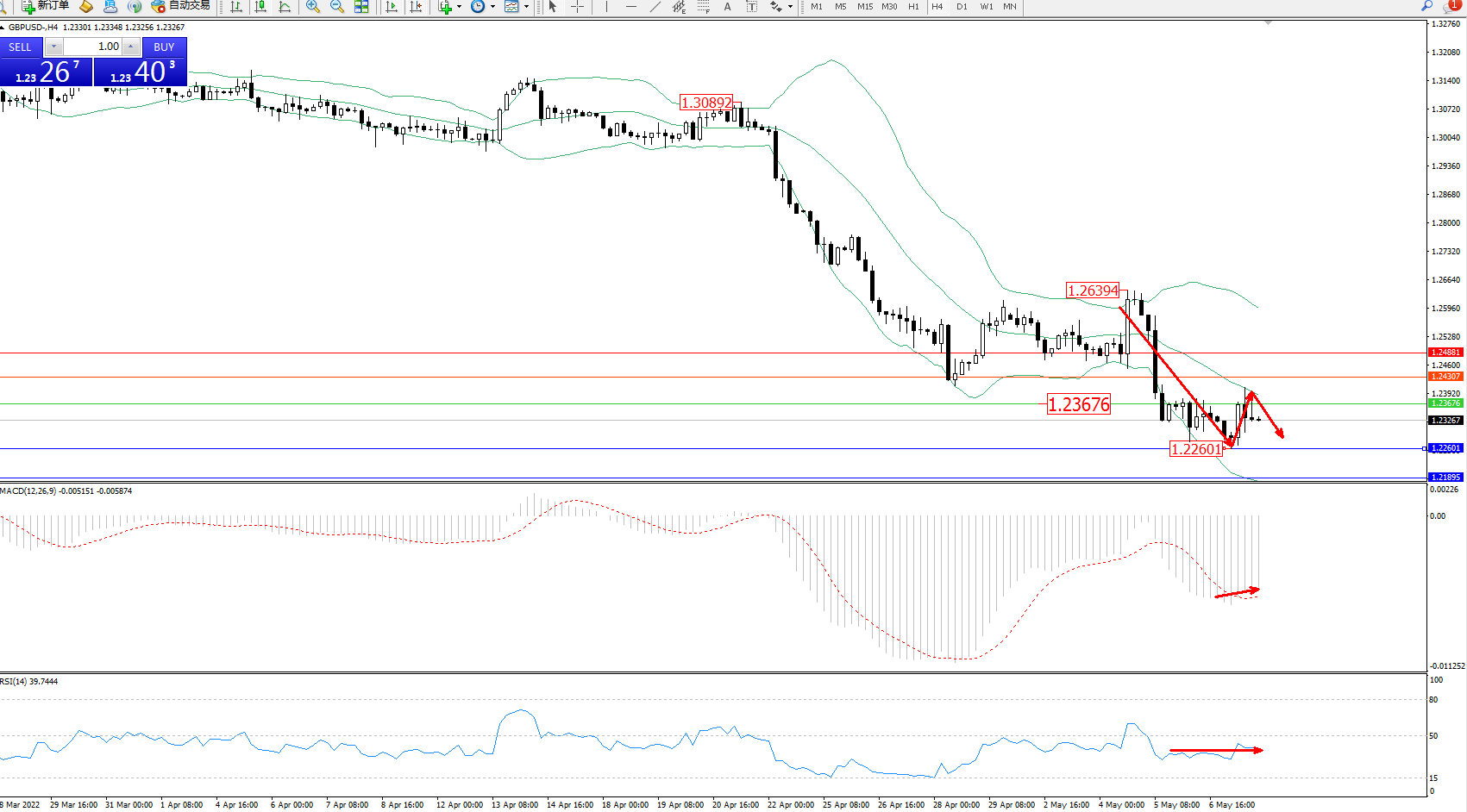 交易策略:1.23676下方看跌,目标1.22601、1.21895