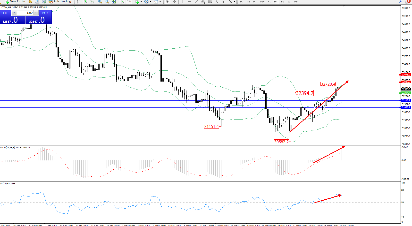 道琼斯指数DJ30——4小时K线图显示: