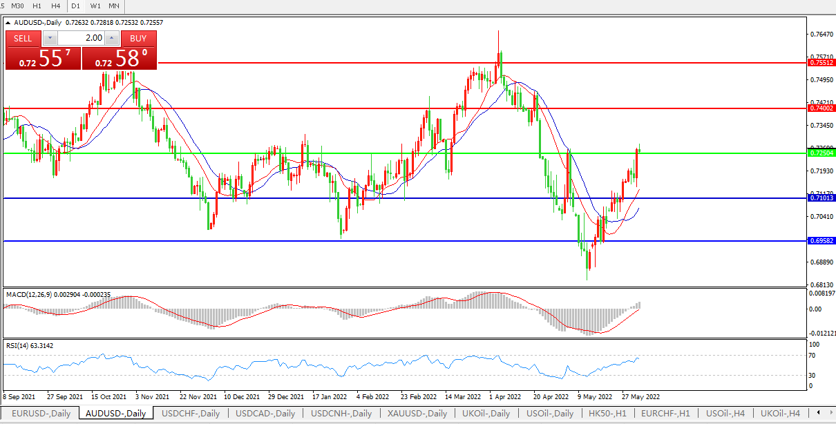 交易策略:0.7250上方看涨,目标0.7400、0.7550