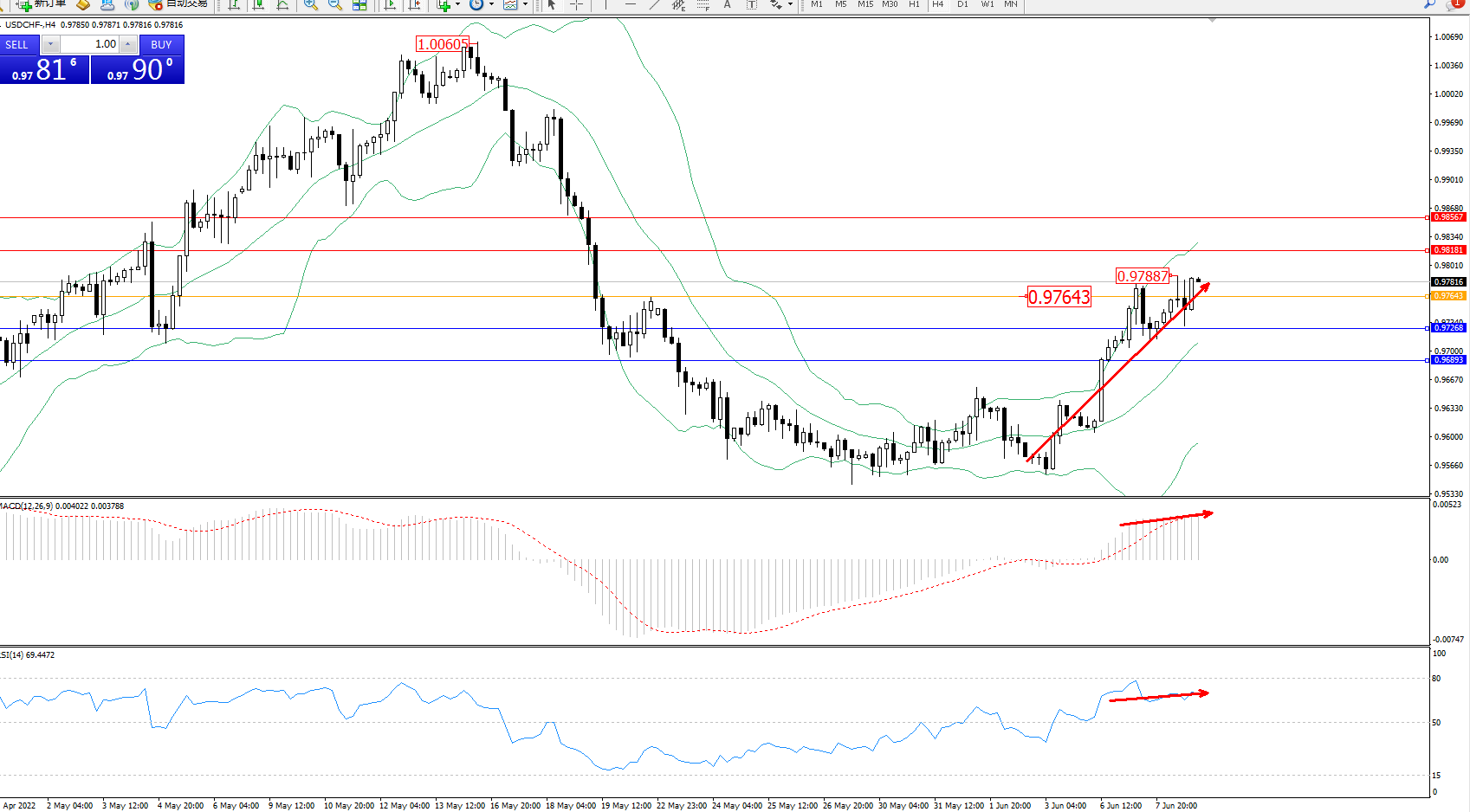 技术点评:低位多头动力延续布林带指标上轨附近强势拉升上扬,高位抵达0.97887附近节点后整理,短期多头动力有继续攀升态势,布林带指标呈收口走势不断拉升,MACD指标处于多头区域维持整理平移,RSI指标处于多头区域维护窄幅整理;
