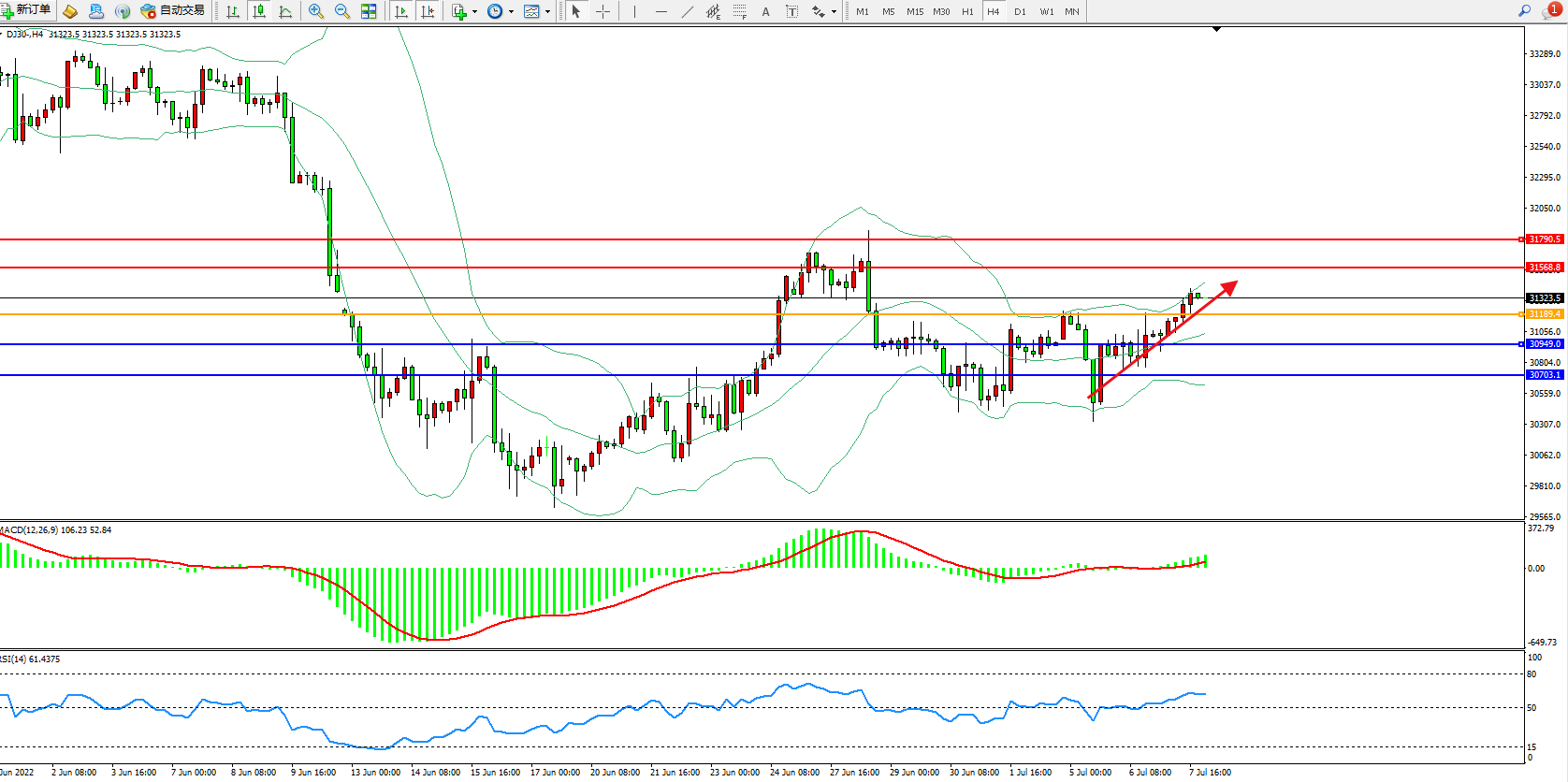 道琼斯指数DJ30——4小时K线图显示: