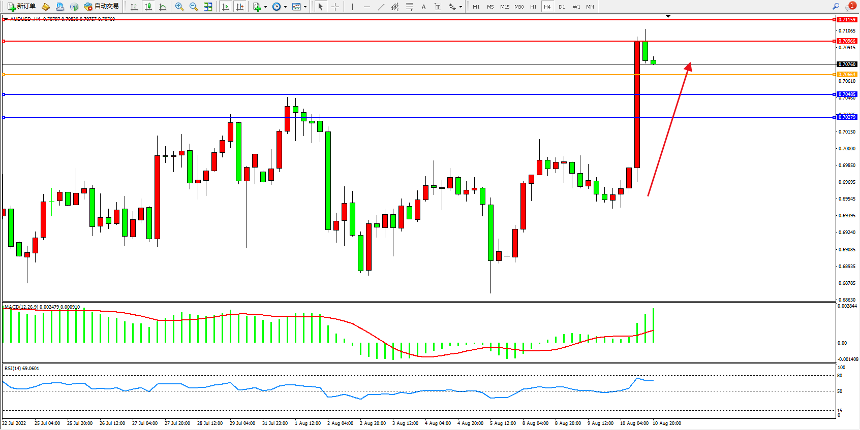 澳元美元AUDUSD——4小时K线图显示: