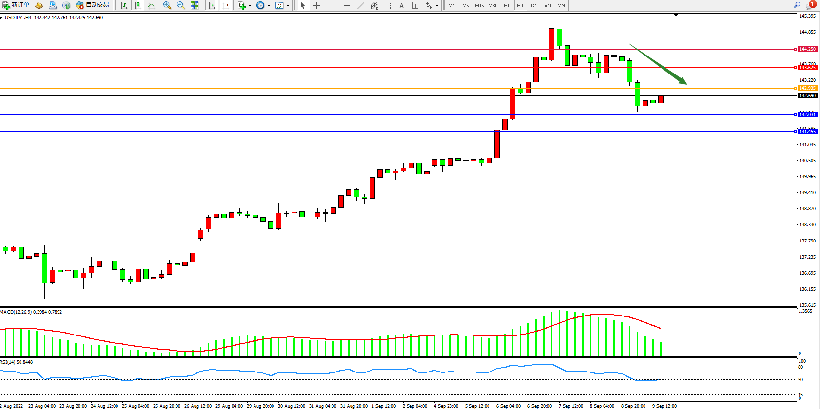 交易策略:142.935下方看跌,目标142.031、141.455