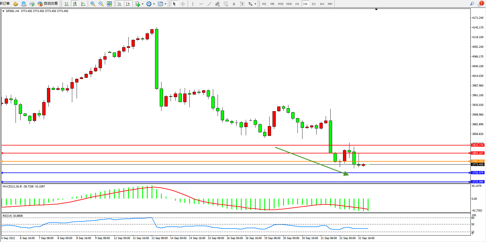 标普SP500——4小时K线图显示: