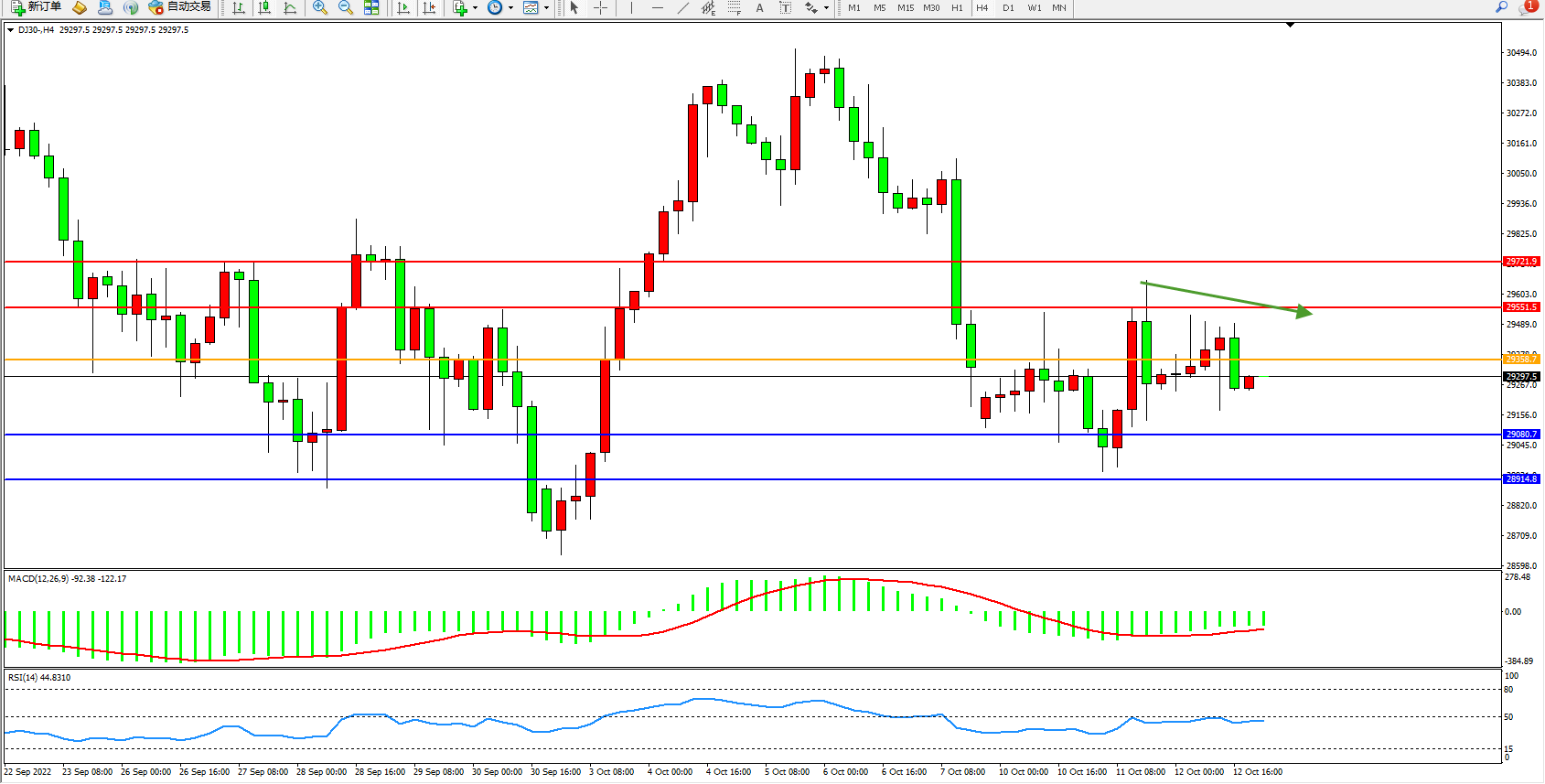 道琼斯指数DJ30——4小时K线图显示: