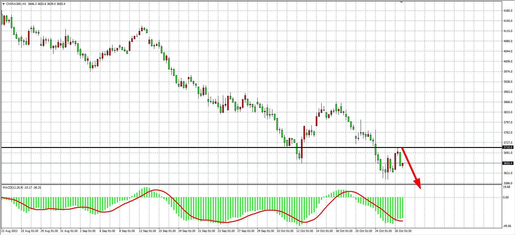 1小时图看,沪深300反弹至3710附近再度出现受阻回落,同时MACD在零轴之下量能依旧较大,显示行情反弹过后仍有进一步走低的需求,大空头趋势仍未变,日内在3710之下继续看跌为主,下方目标3600-3550,若意外上破3710则看3800-3560附近。