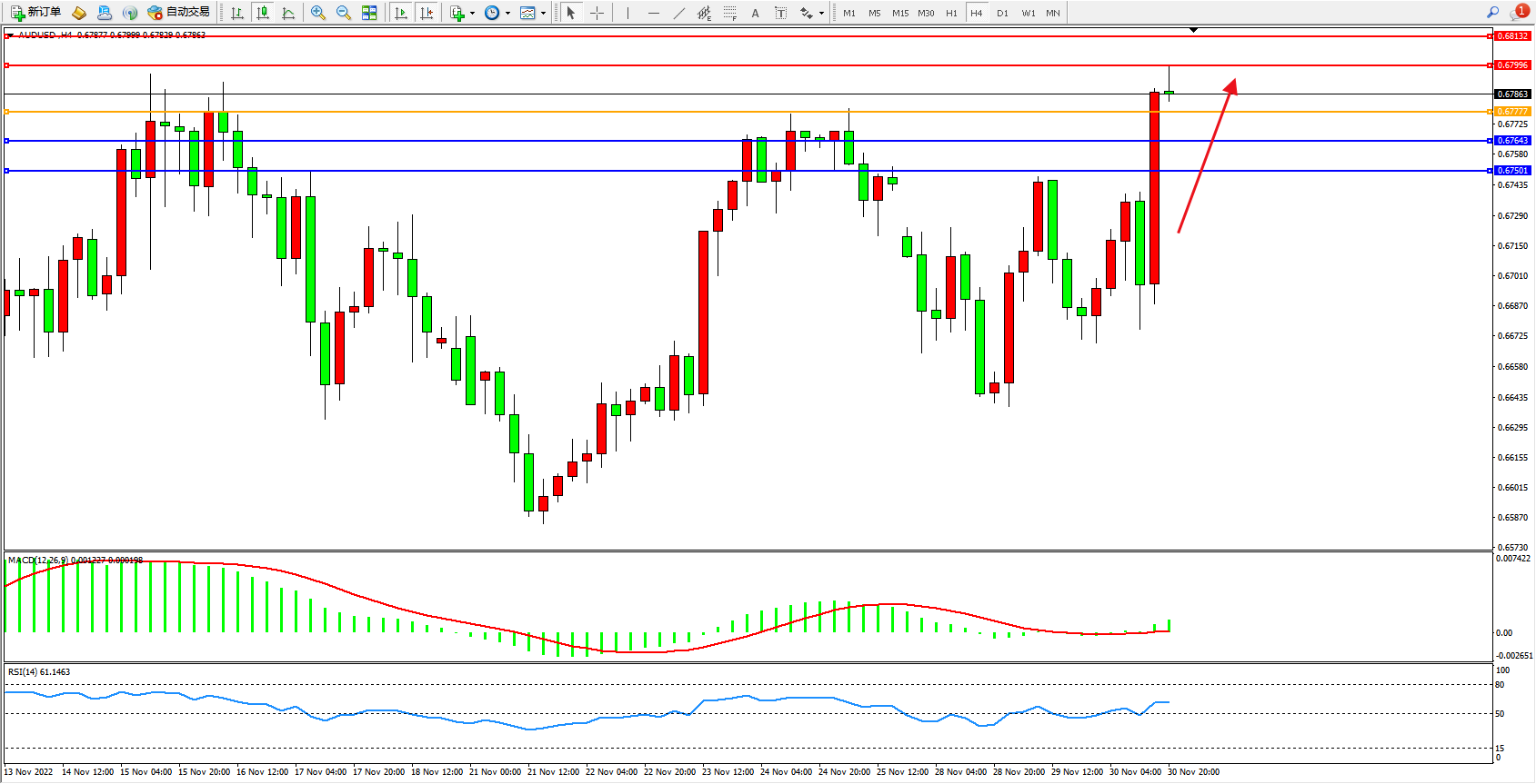 澳元美元AUDUSD——4小时K线图显示: