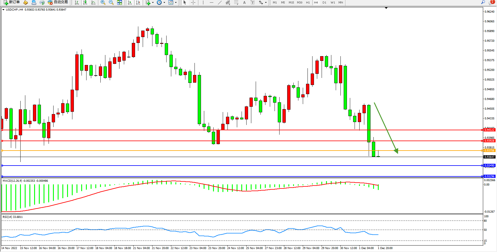 美元瑞郎USDCHF——4小时K线图显示: