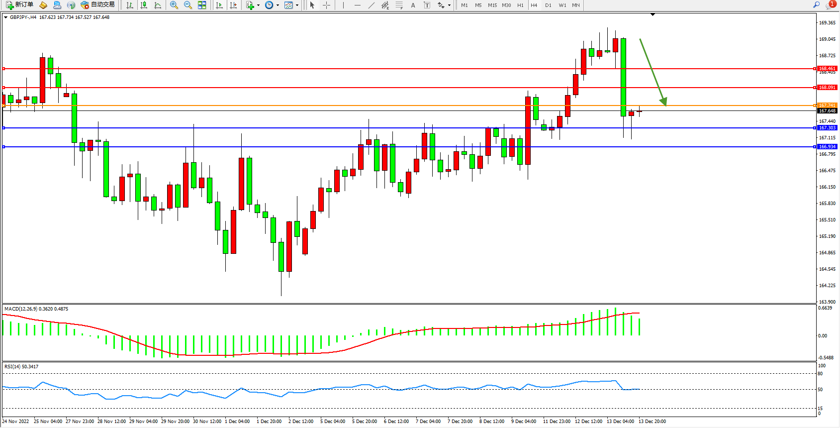 交易策略:167.741下方看跌,目标167.303、166.934