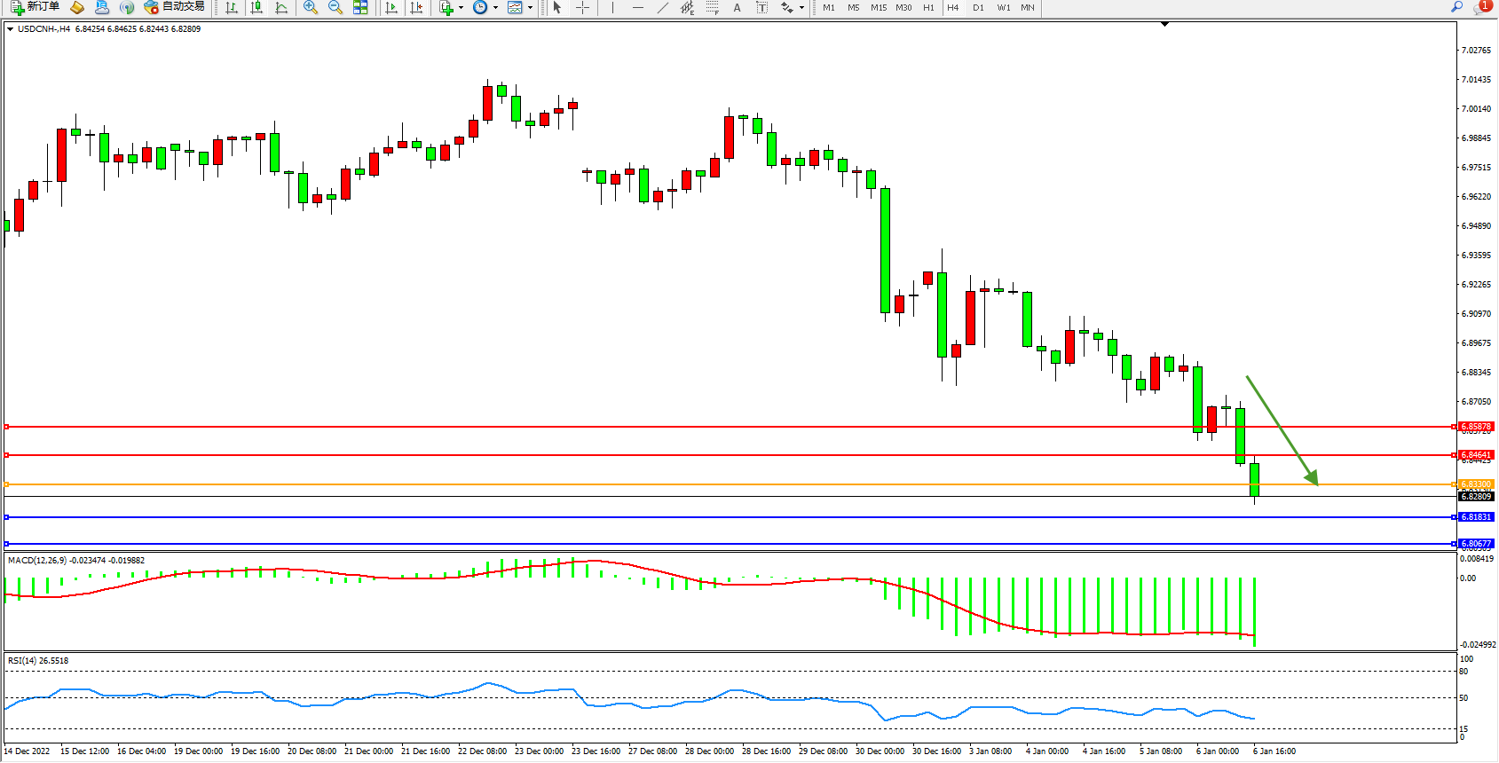 交易策略:6.83300下方看跌,目标6.81831、6.80677