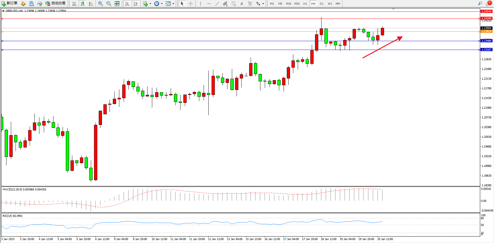 交易策略:1.23954上方看涨,目标1.23290、1.24544