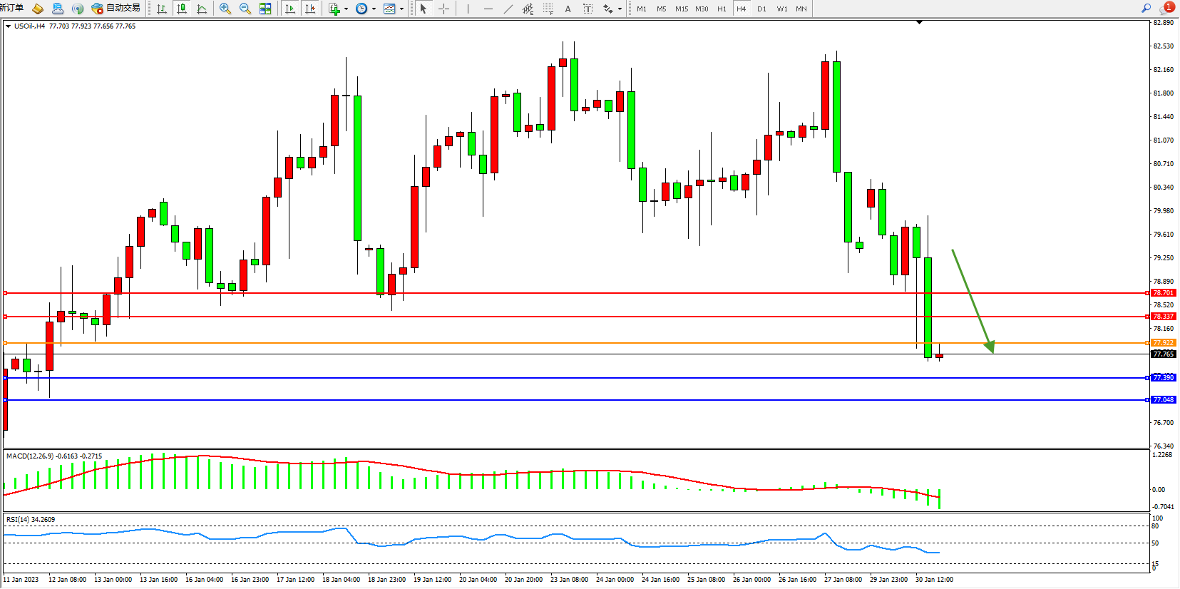 交易策略:77.922下方看跌,目标77.390、77.048