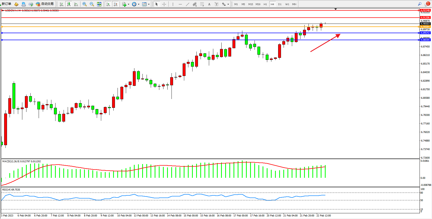 交易策略:6.90084上方看涨,目标6.91306、6.92248
