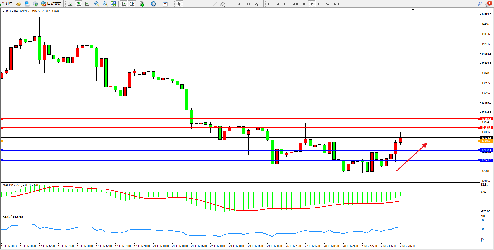 交易策略:32986上方看涨,目标33153、33265