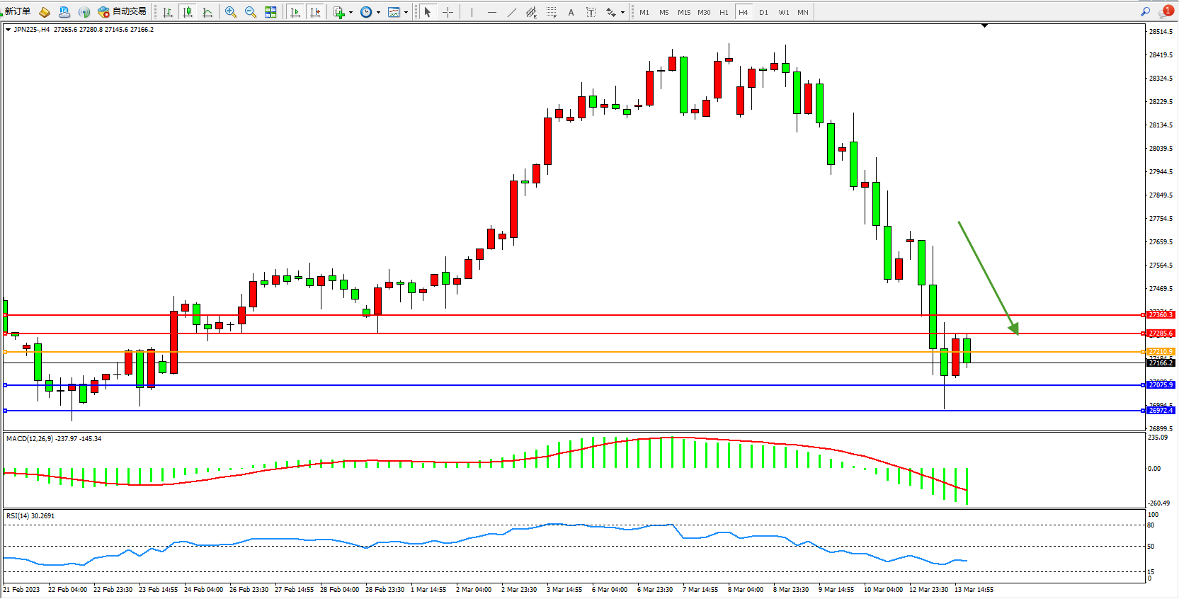 交易策略:27210下方看跌,目标27075  26972