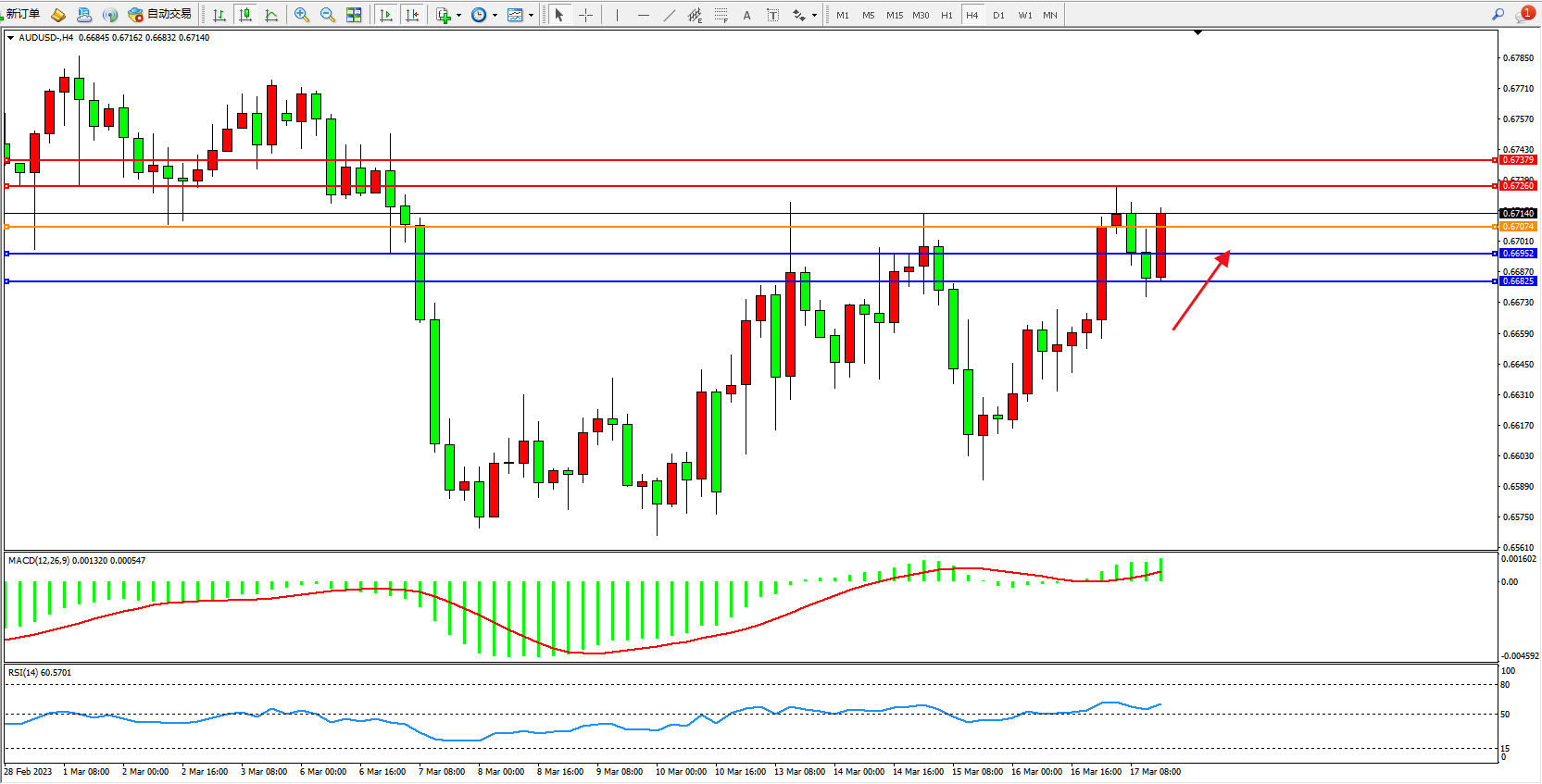 交易策略:0.67074上方看涨,目标0.67260 0.67379