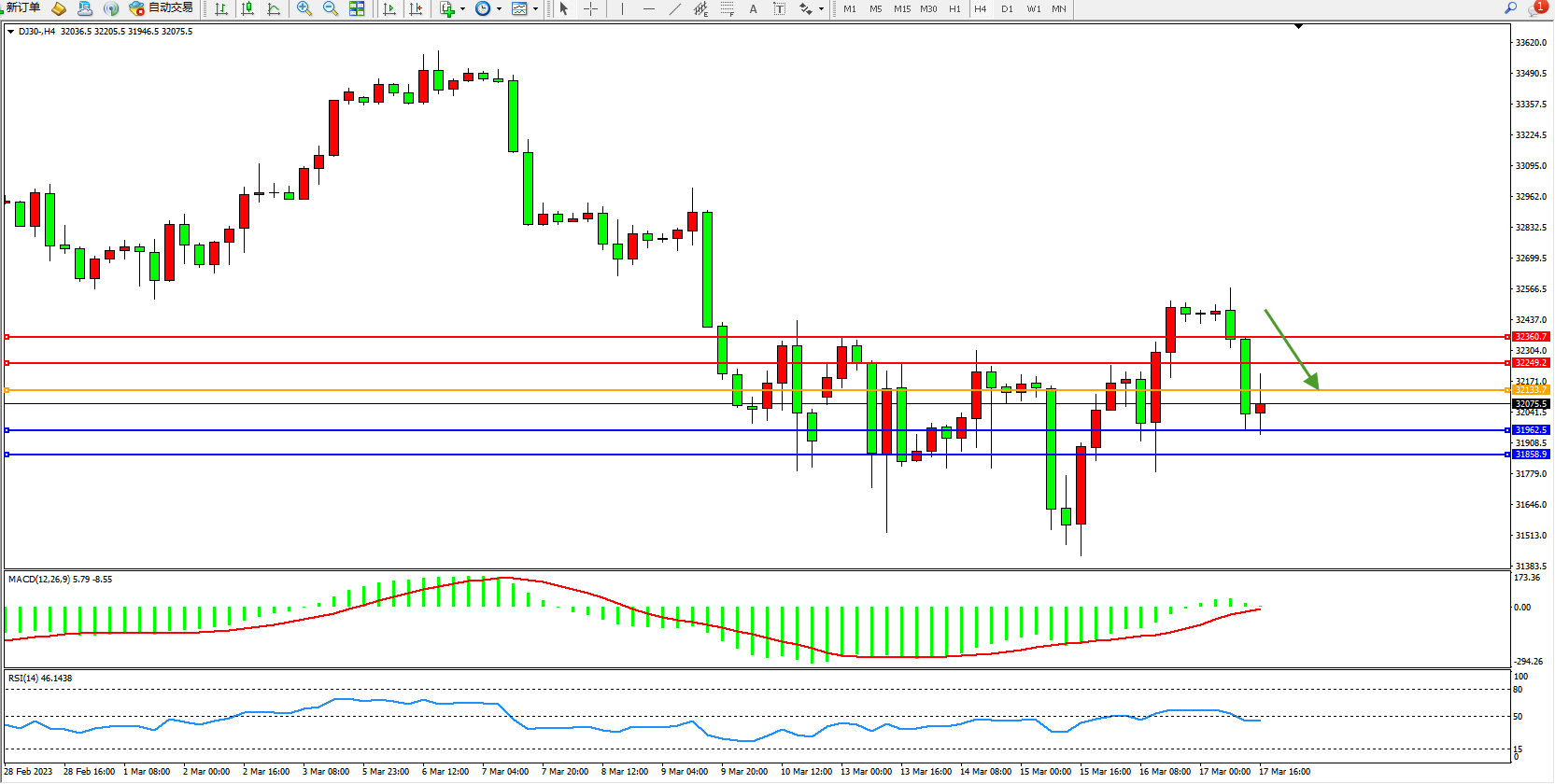 道琼斯指数DJ30——4小时K线图显示: