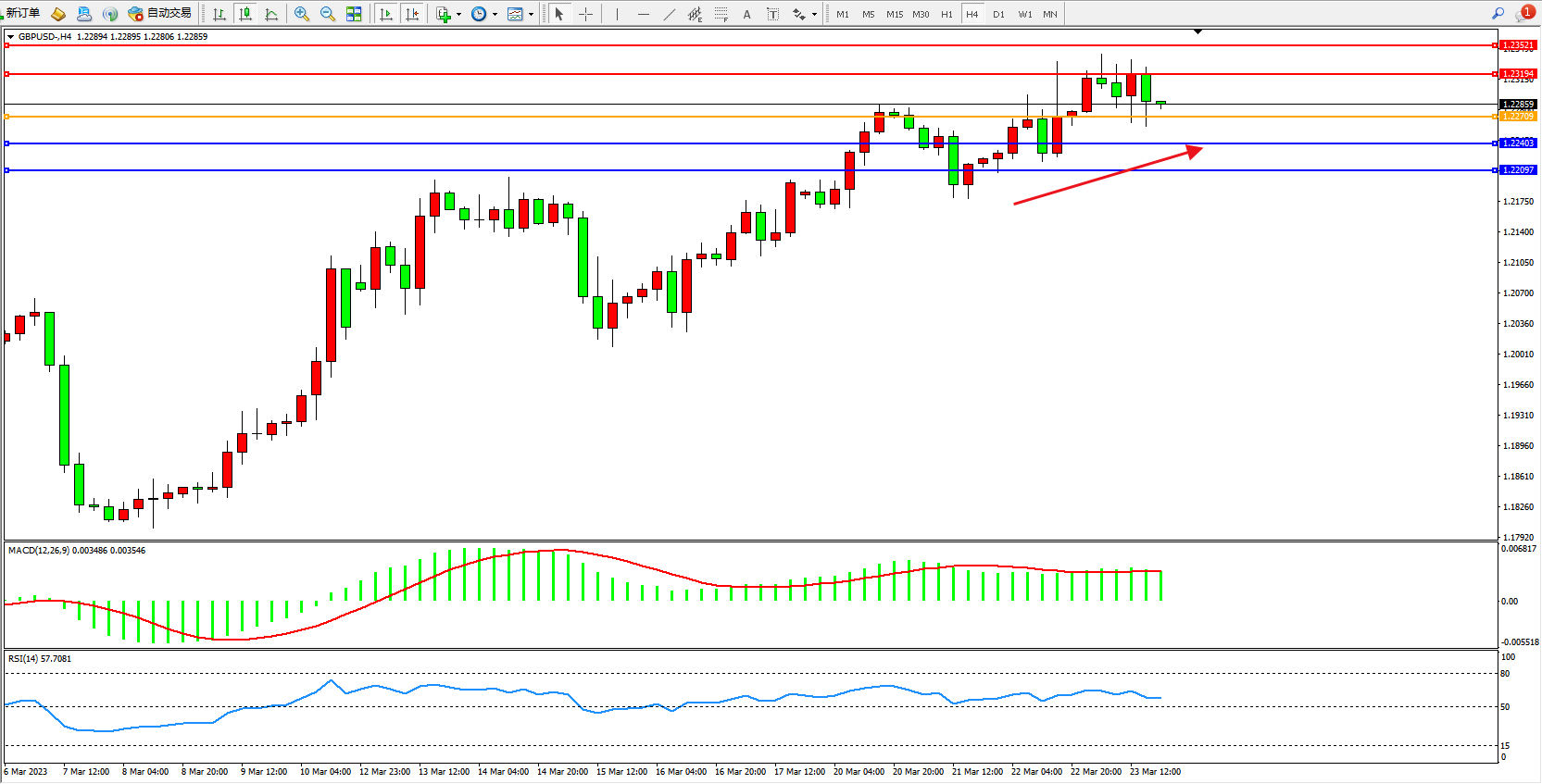 交易策略:1.22709上方看涨,目标1.23194  1.23521