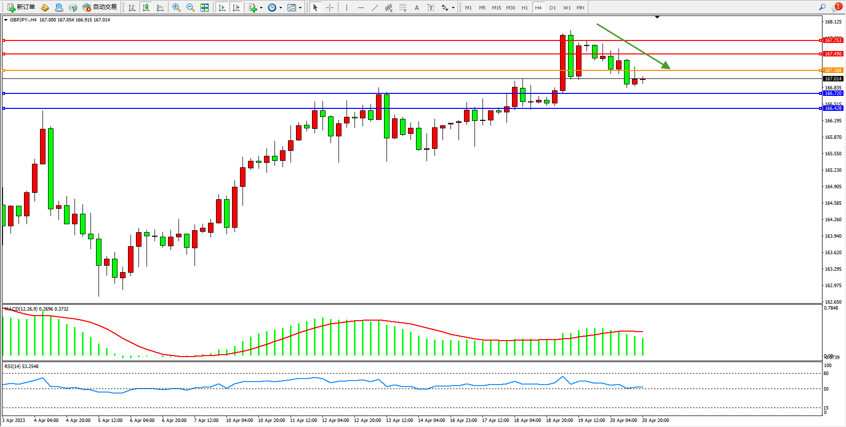 交易策略:167.168下方看跌,目标166.720 166.428