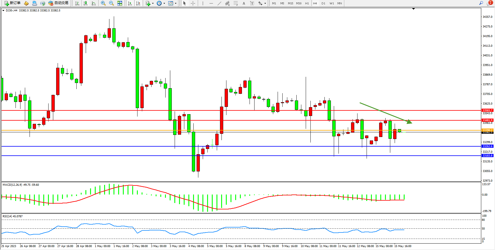 道琼斯指数DJ30——4小时K线图显示: