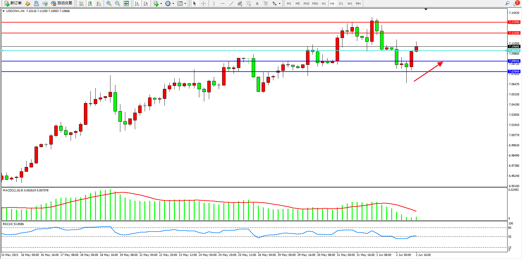 交易策略:7.10174上方看涨,目标7.12150 7.13350