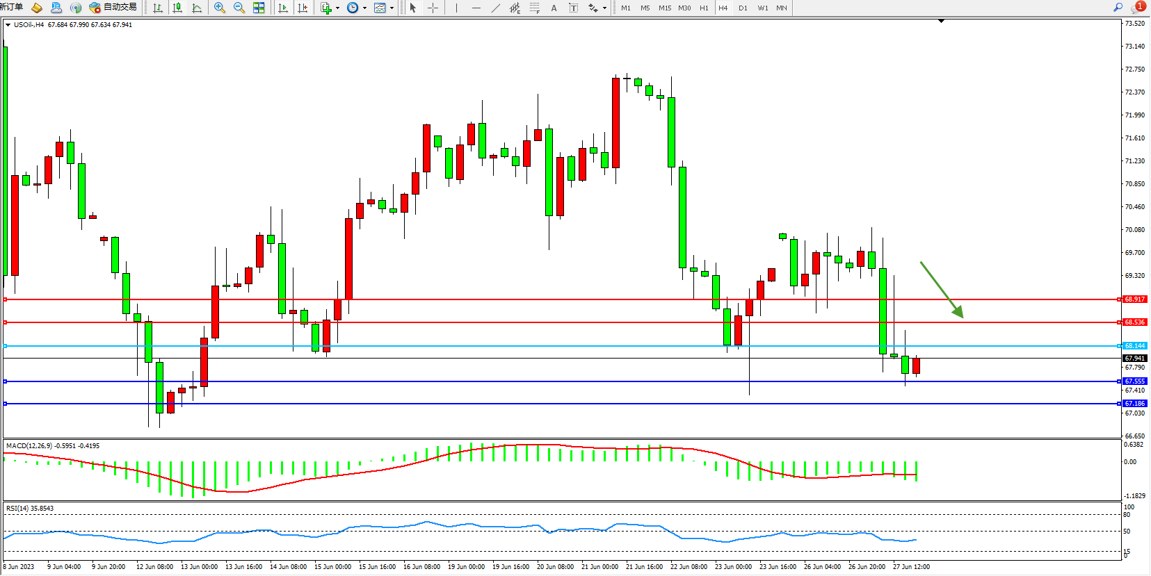 交易策略:68.144下方看跌,目标67.555  67.186