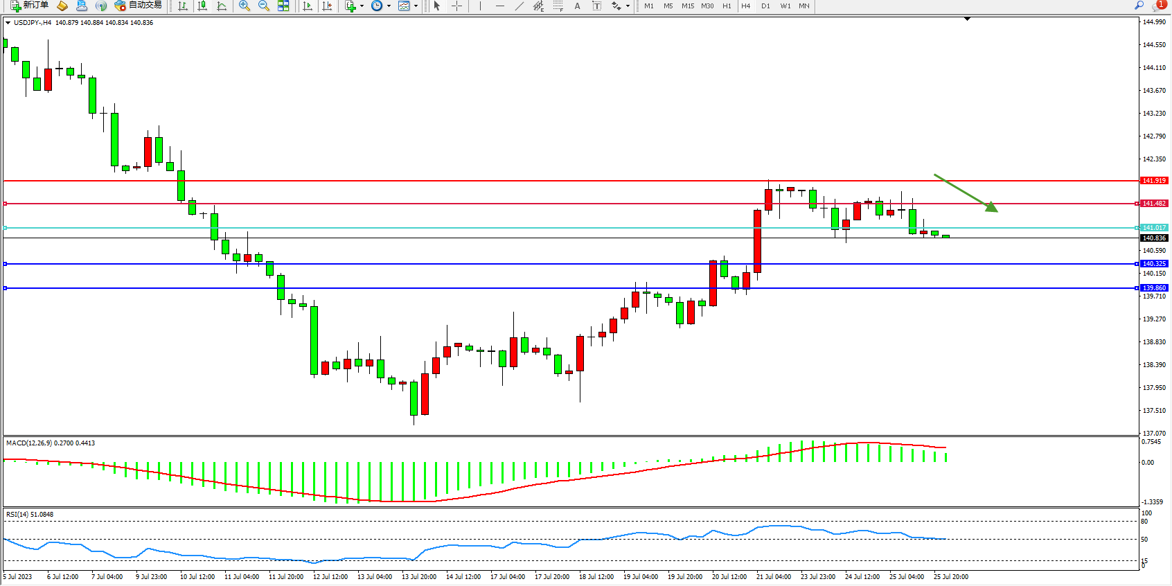 交易策略:141.017下方看跌,目标140.325 139.860