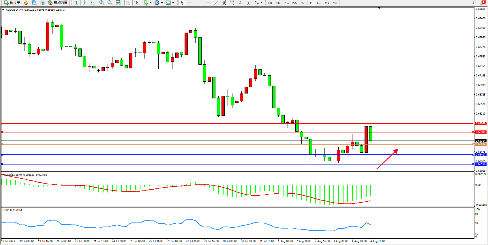 澳元美元AUDUSD——4小时K线图显示: