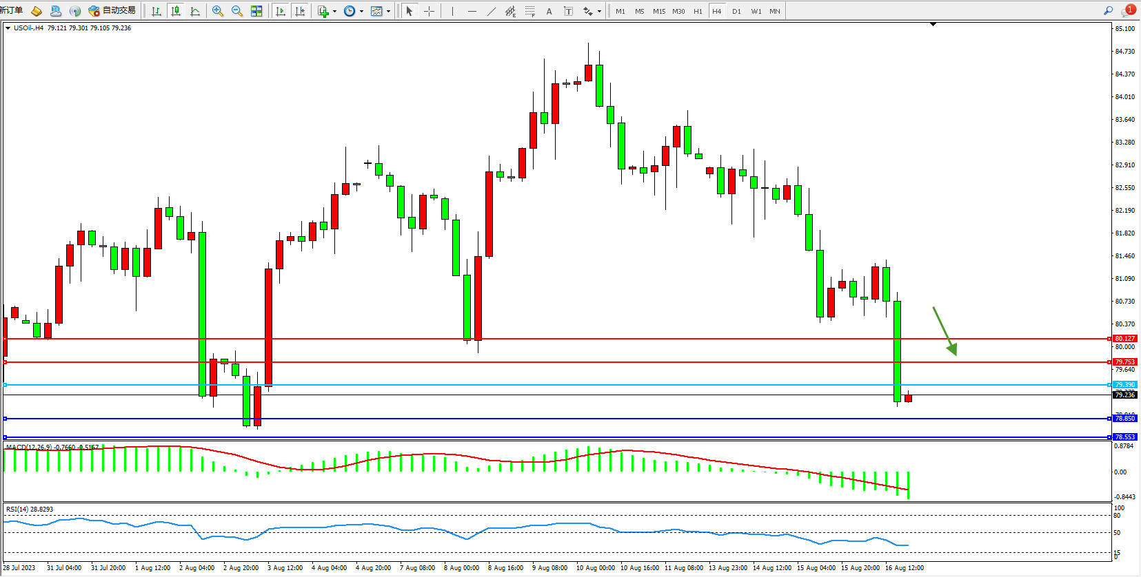 交易策略:79.390下方看跌,目标78.850  78.553