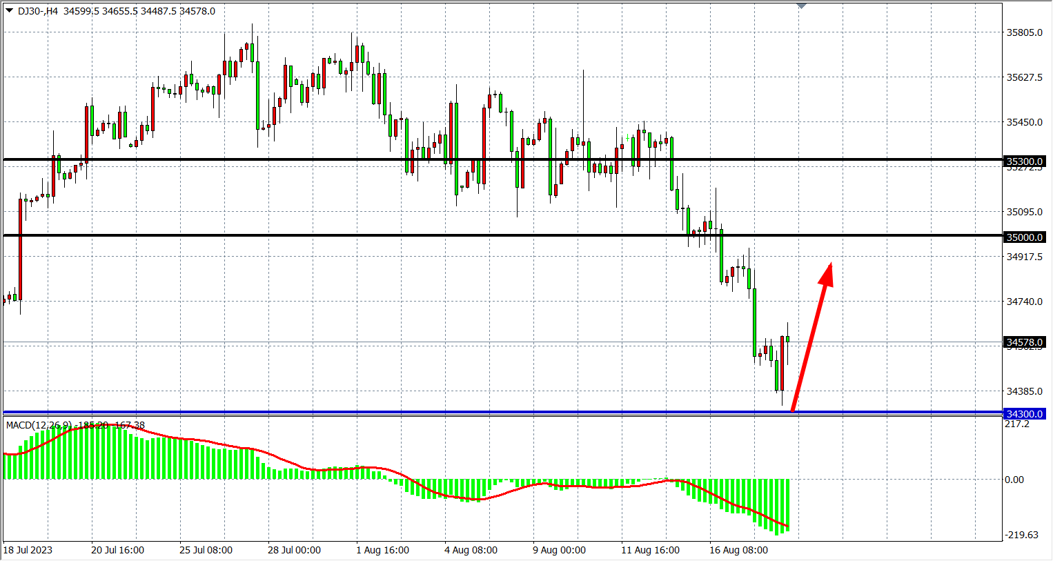 交易策略:34300 下方看跌,目标 34000 33800
