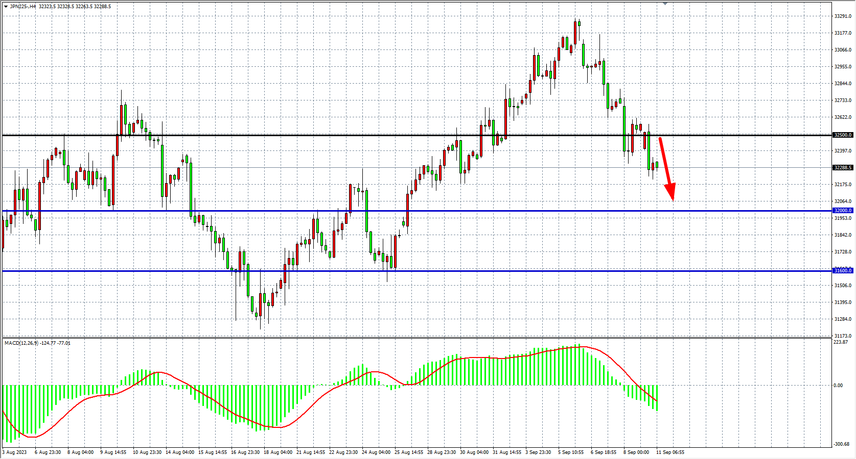 4小时图看,日经指数继续在32500之下回落,MACD量能在零轴下放大,阻力继续关注32500附近,下方看32200-32000附近。