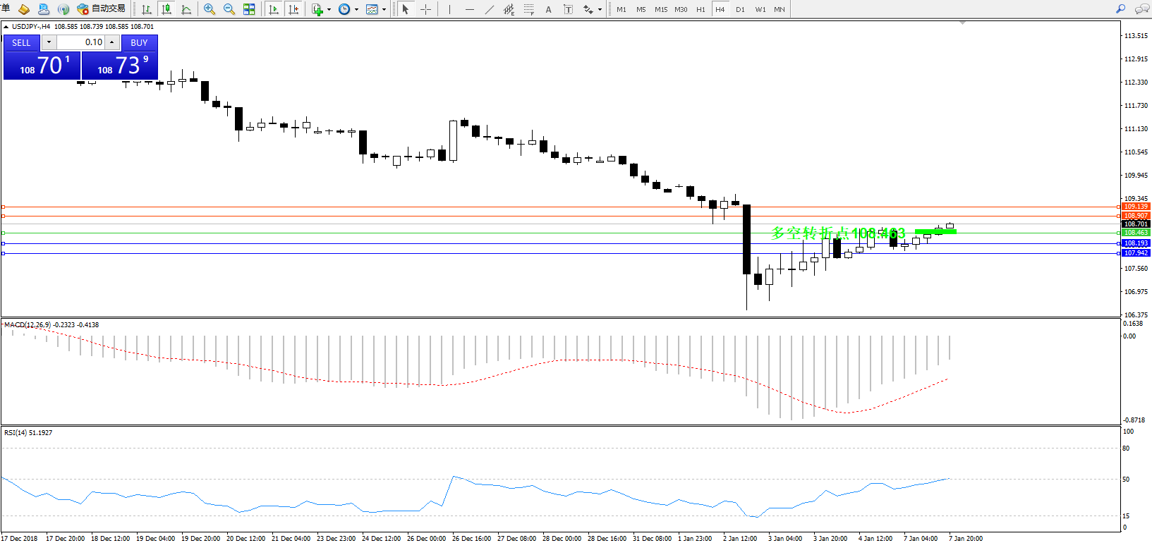 交易策略:108.463上方看涨,目标108.907109.139