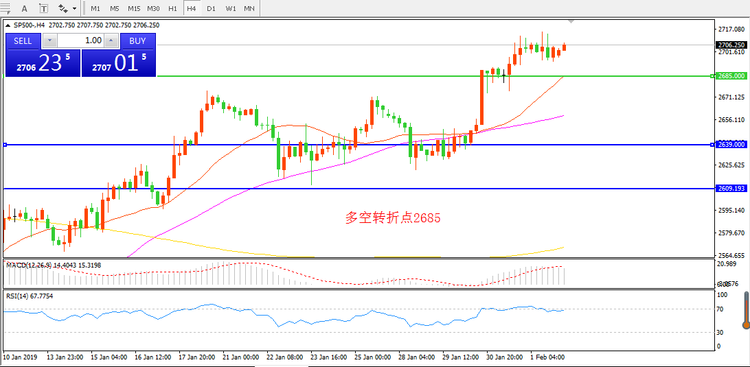 4小时图看,SP500在短期整理后延续上行,均线逐渐走高,MACD红柱增加,2685支撑走稳的情况下延续多头思路。