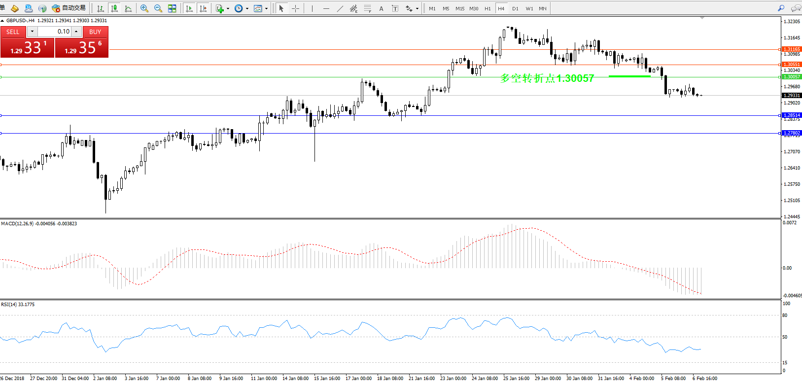 交易策略:1.30057下方看跌,目标1.28514、1.27802