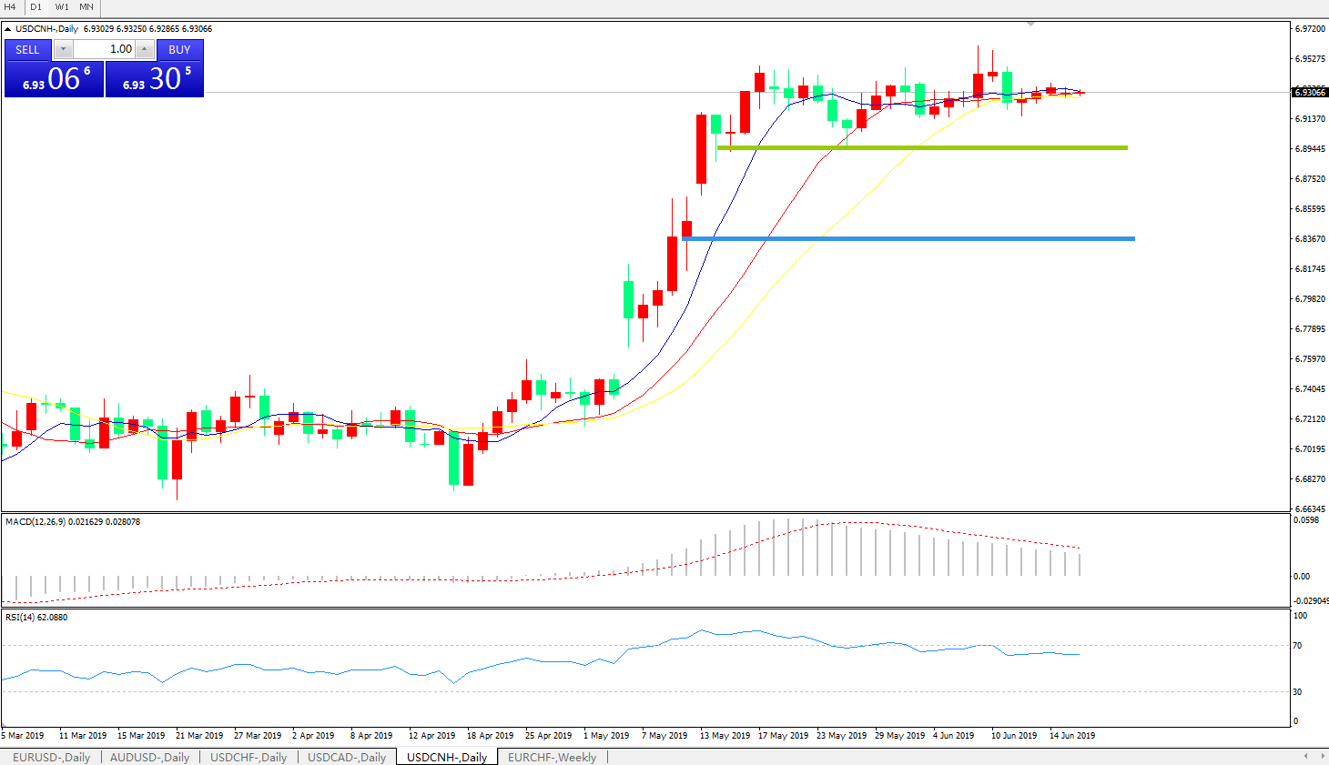 技术面简析:日线图均线粘合延续整理,MACD在0轴上方运行但动能柱持续缩量,RSI下穿超卖区域后走平,预计短期汇价有整理回落需求,中期重点关注中美贸易争端后续进展。