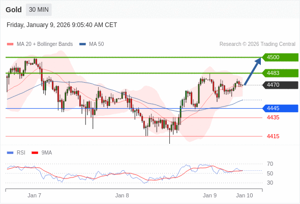 交易策略: 在 4445 之上,看涨,目标价位为 4483 ,然后为 4500 。