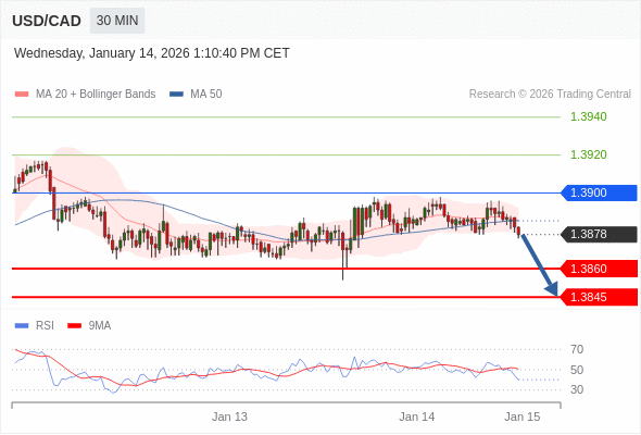 在 1.3900 之下,看跌,目标价位为 1.3860 ,然后为 1.3845 。