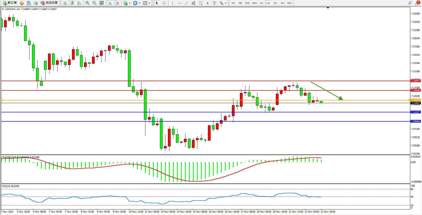 备选策略:7.14239上方看涨,目标7.16638、7.18957