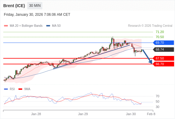 交易策略: 在 69.70 之下,看跌,目标价位为 67.50 ,然后为 66.70 。